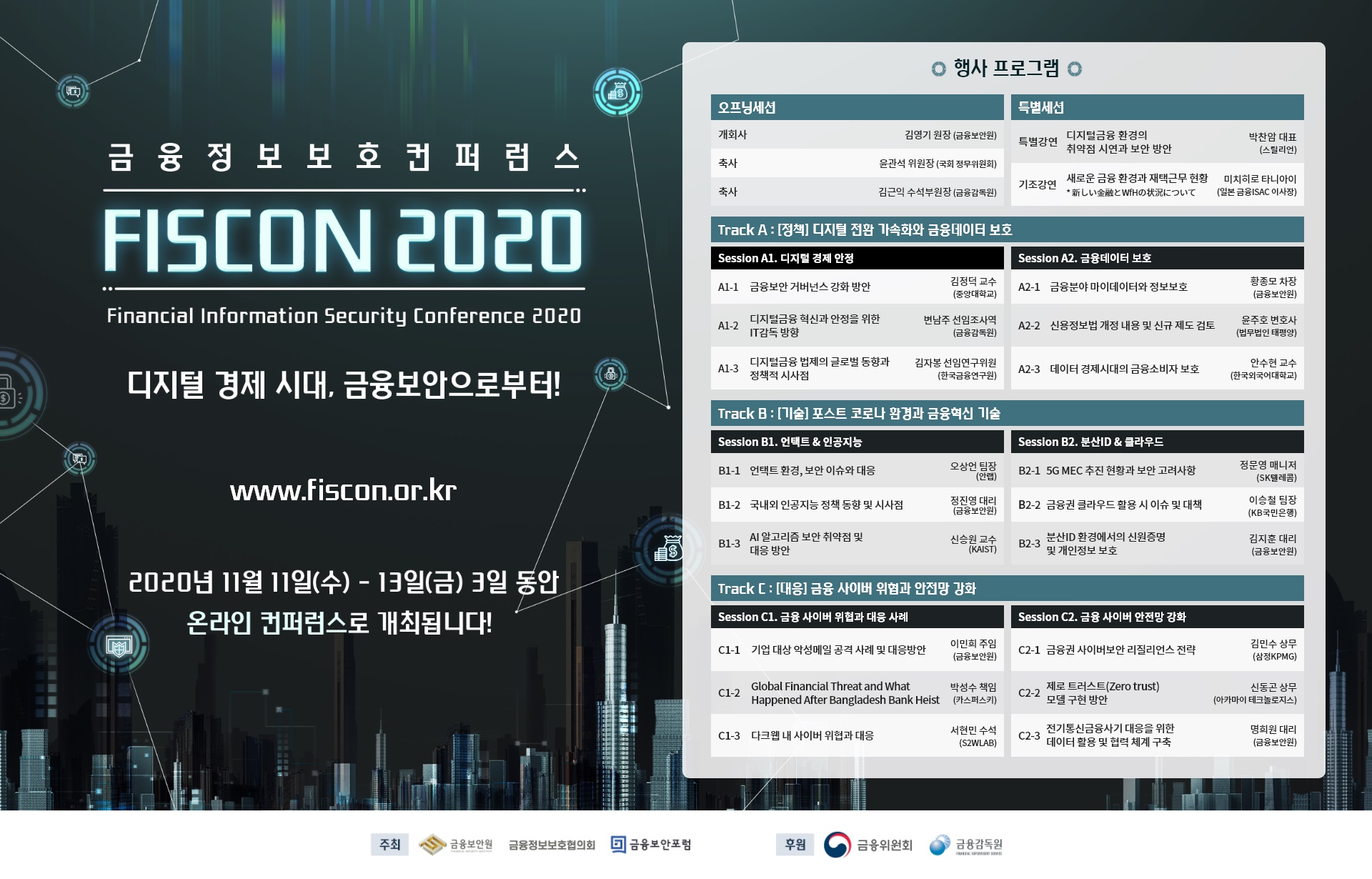 포스트 코로나 시대 금융환경 변화에 따른 금융보안 위협과 정책•기술•대응과 관련한 다양한 주제의 총 20개 프로그램으로 구성되어 있습니다.