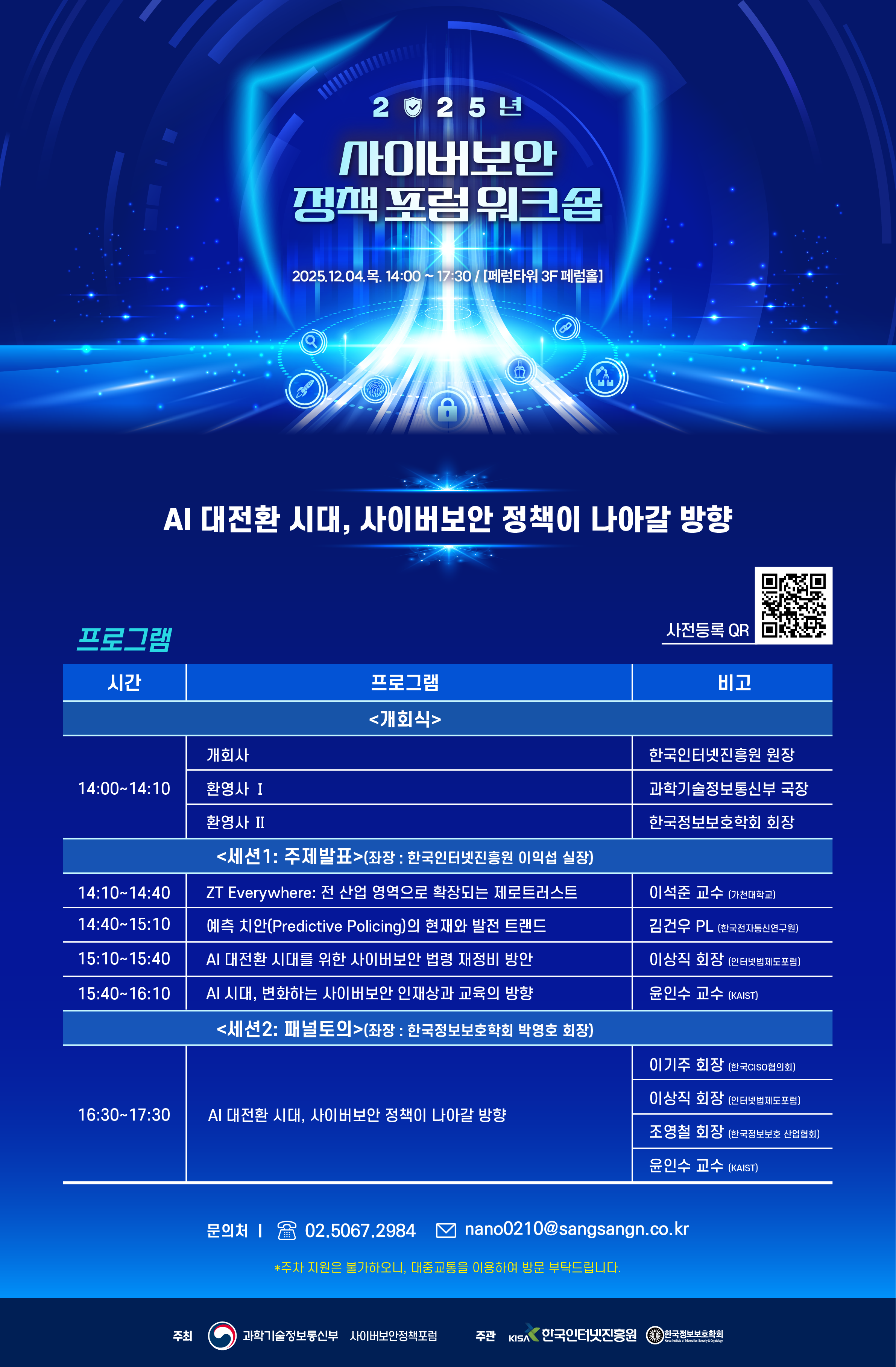 워크숍의 대주제는 <AI 대전환 시대, 사이버보안 정책이 나아갈 방향>으로 AI 기술의 빠른 확산과 이에 수반되는 위협에 대응하기 위해 사이버보안 전문가, 정책수요자들이 모여 현안 공유와 정책적 대응 방향을 모색하기 위한 주제발표 및 패널토의가 진행됩니다.