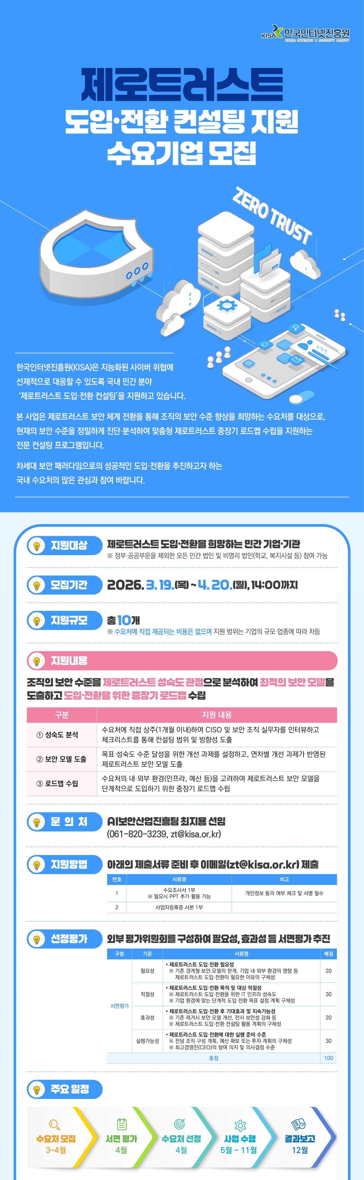 국내 민간 분야의 성공적인 제로트러스트 도입 및 전환을 위하여 「2026년 제로트러스트 도입·전환 컨설팅 수요처 모집」을 아래와 같이 진행하오니 많은 관심 부탁드립니다.