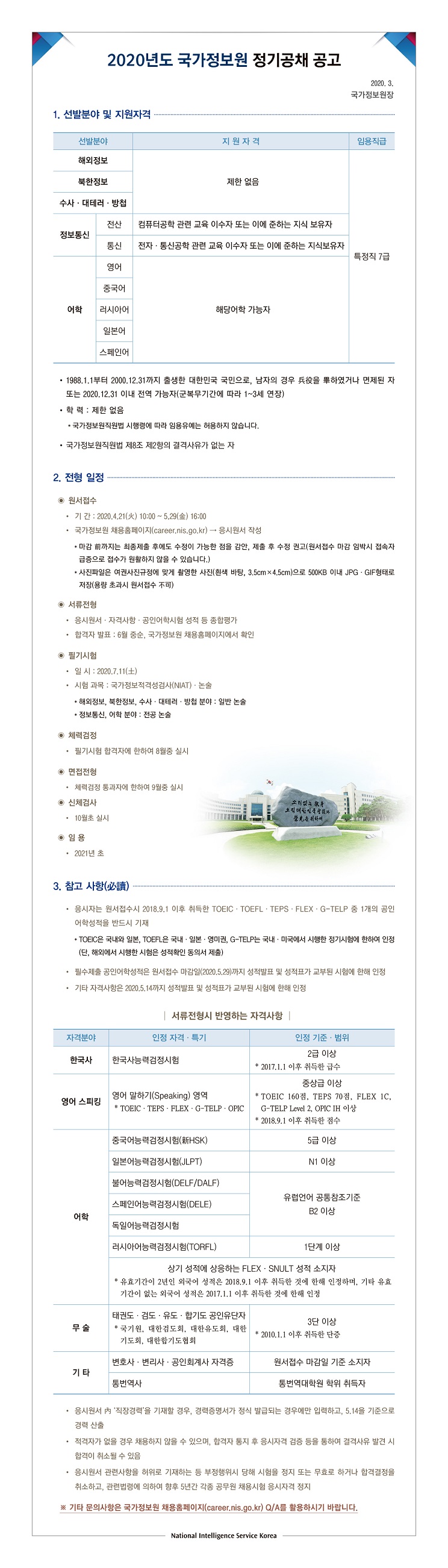 [NIS] 2020년도 국가정보원 7급 정기공채 모집 공고