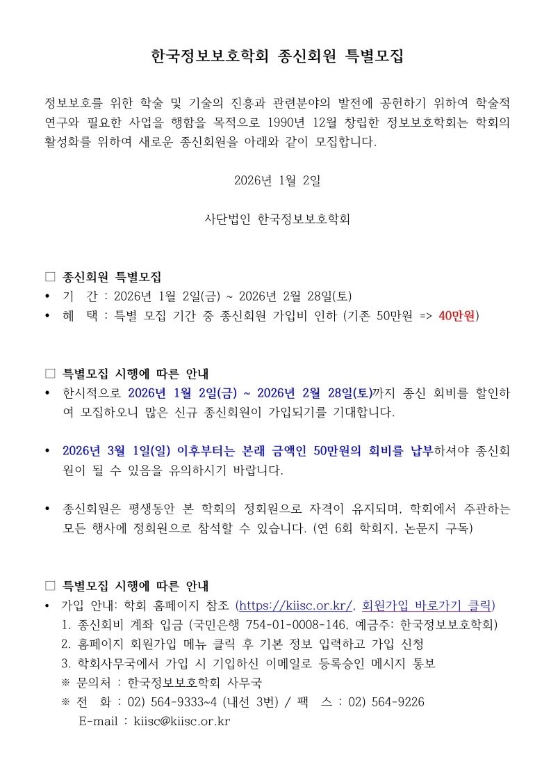 [KIISC] 2026년도 종신회원 특별모집 안내 (~2/28(토))