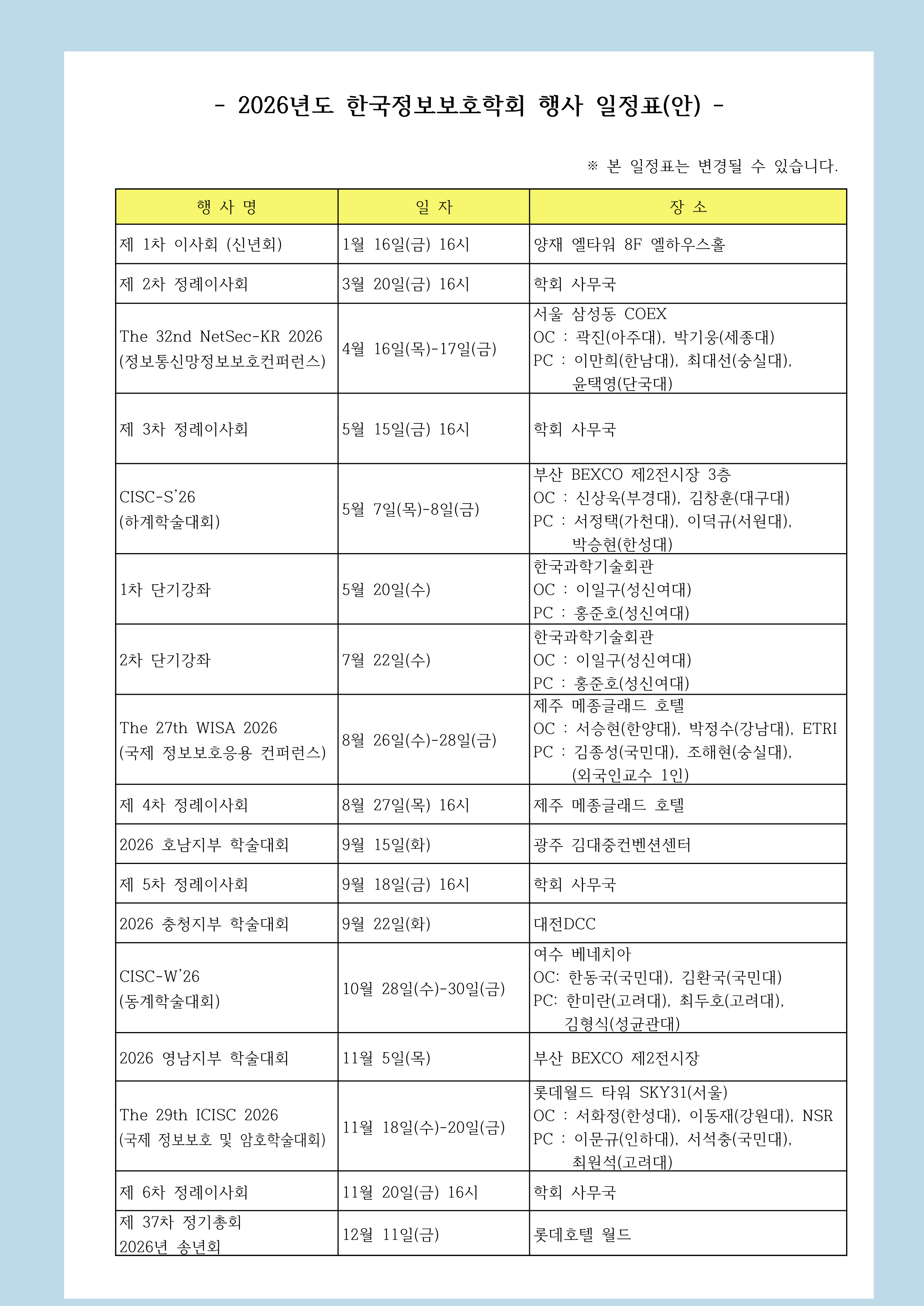 [KIISC] 2026년도 학회 행사 일정(안)