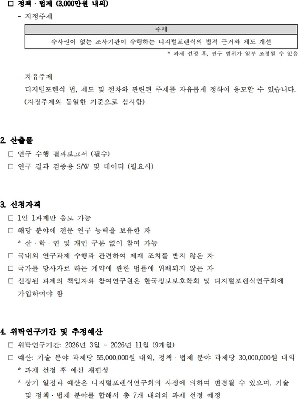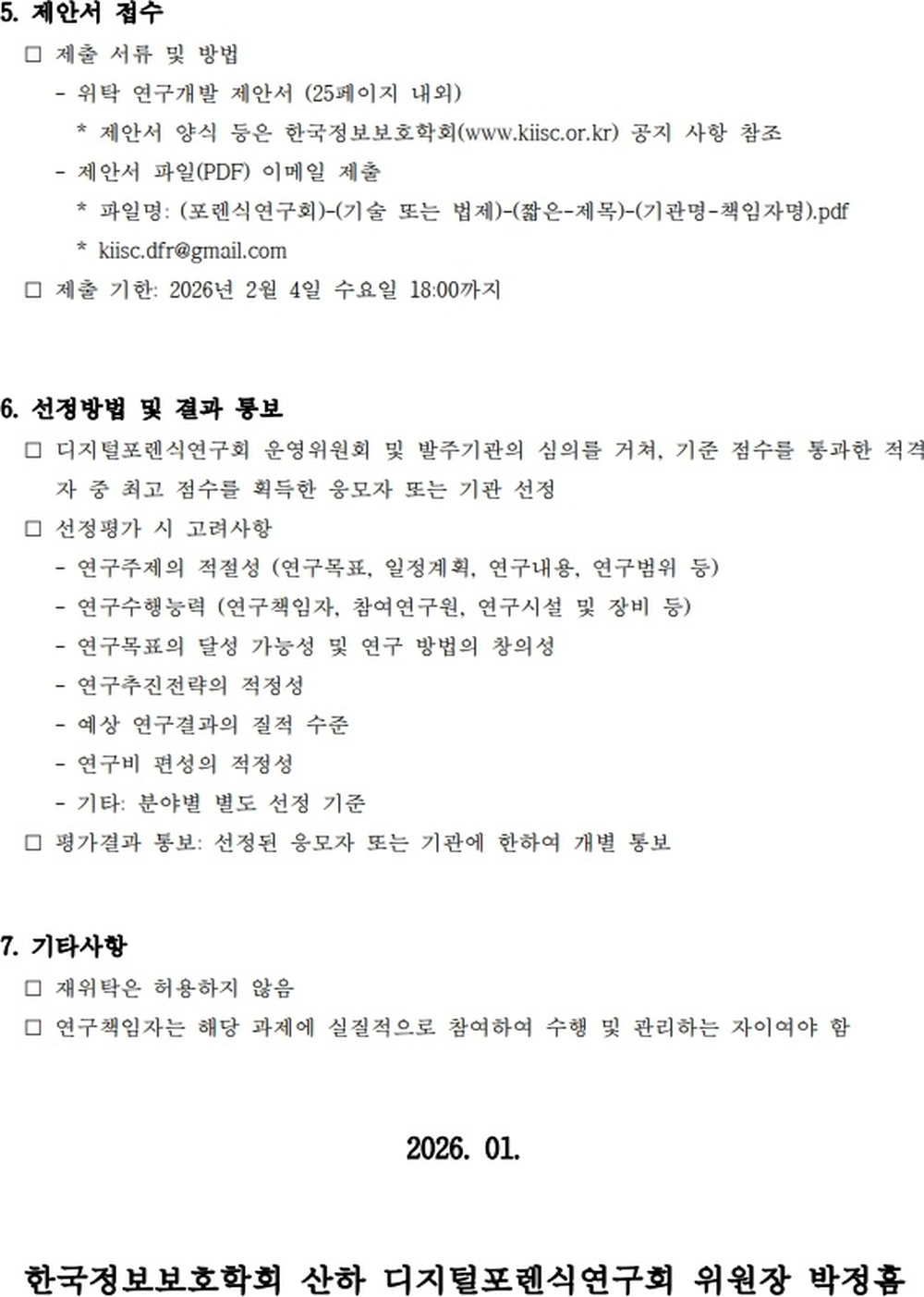 첨부파일 2026-디지털포렌식연구회-위탁연구과제-공고문.pdf 2026-디지털포렌식연구회-위탁연구과제-제안서양식.hwp 2026-디지털포렌식연구회-위탁연구과제-예산편성기준-및-집행지침.pdf
