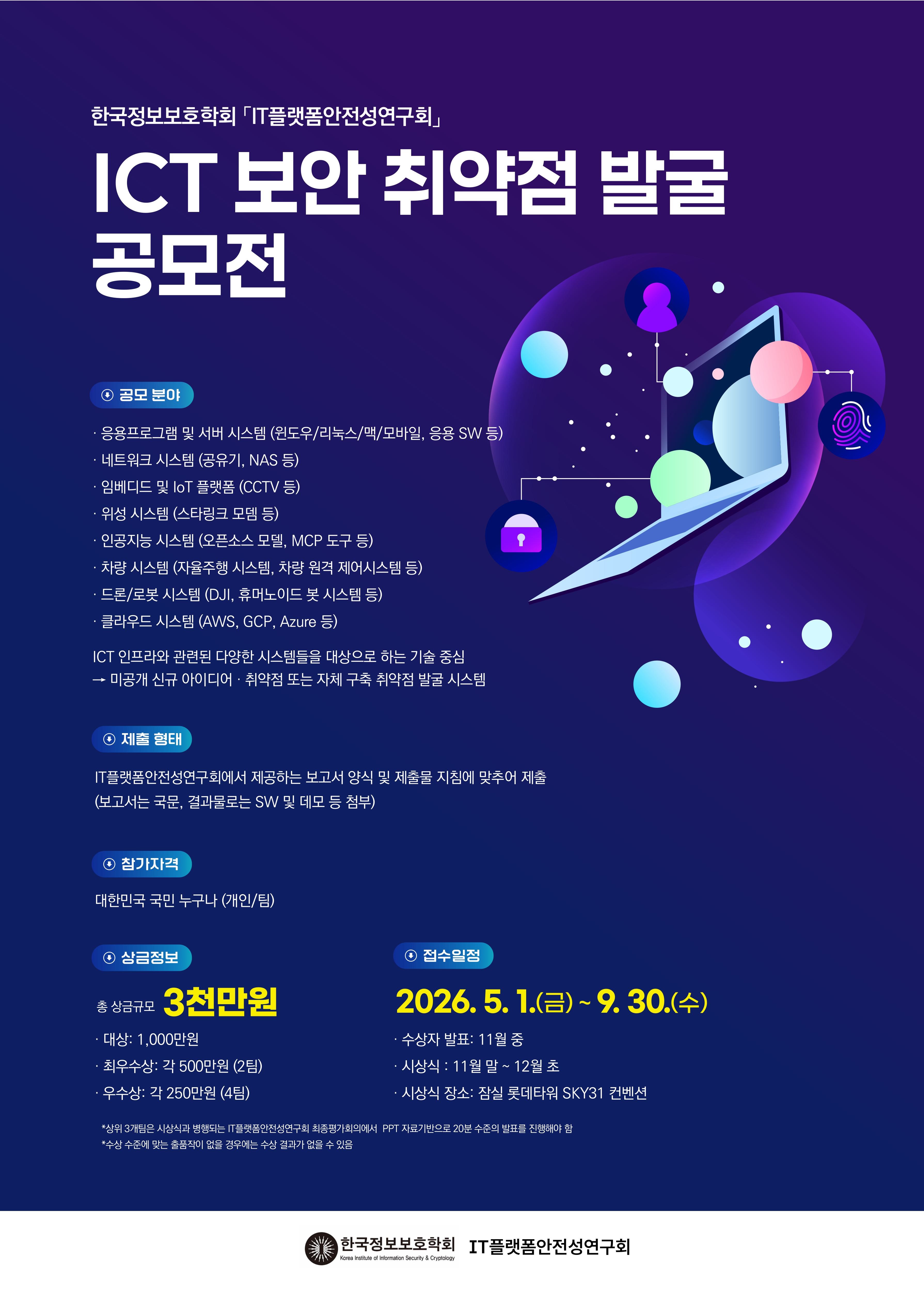 1.개요: 기존의ICT 플랫폼과 더불어 최근 새롭게 발달하고 있는 차세대 미래IT기술들(클라우드/드론/위성 등) 과 관련하여, 공격자적 관점의 기술들을 조기에 파악하고 선제적인 보안대응을 하기 위한 기술들을 공모함. 특히, ICT 플랫폼의 안전성을 침해하거나 보안 사고를 유발할 가능성이 있는 기술 및 아이디어에 관한 연구내용, 그와 관련된 보안 취약점 발굴을 위한 시스템 구축/설계, 잠재적 보안 위협 가능성을 검증할 수 있는 개념증명 코드 등을 공모함. 공모대상물은 아이디어/개발/결과물을 종합하는 형태로서 학계에서 다루는 학술적 연구의 형식보다는 실무/실용성에 초점을 두는 것을 지향함.